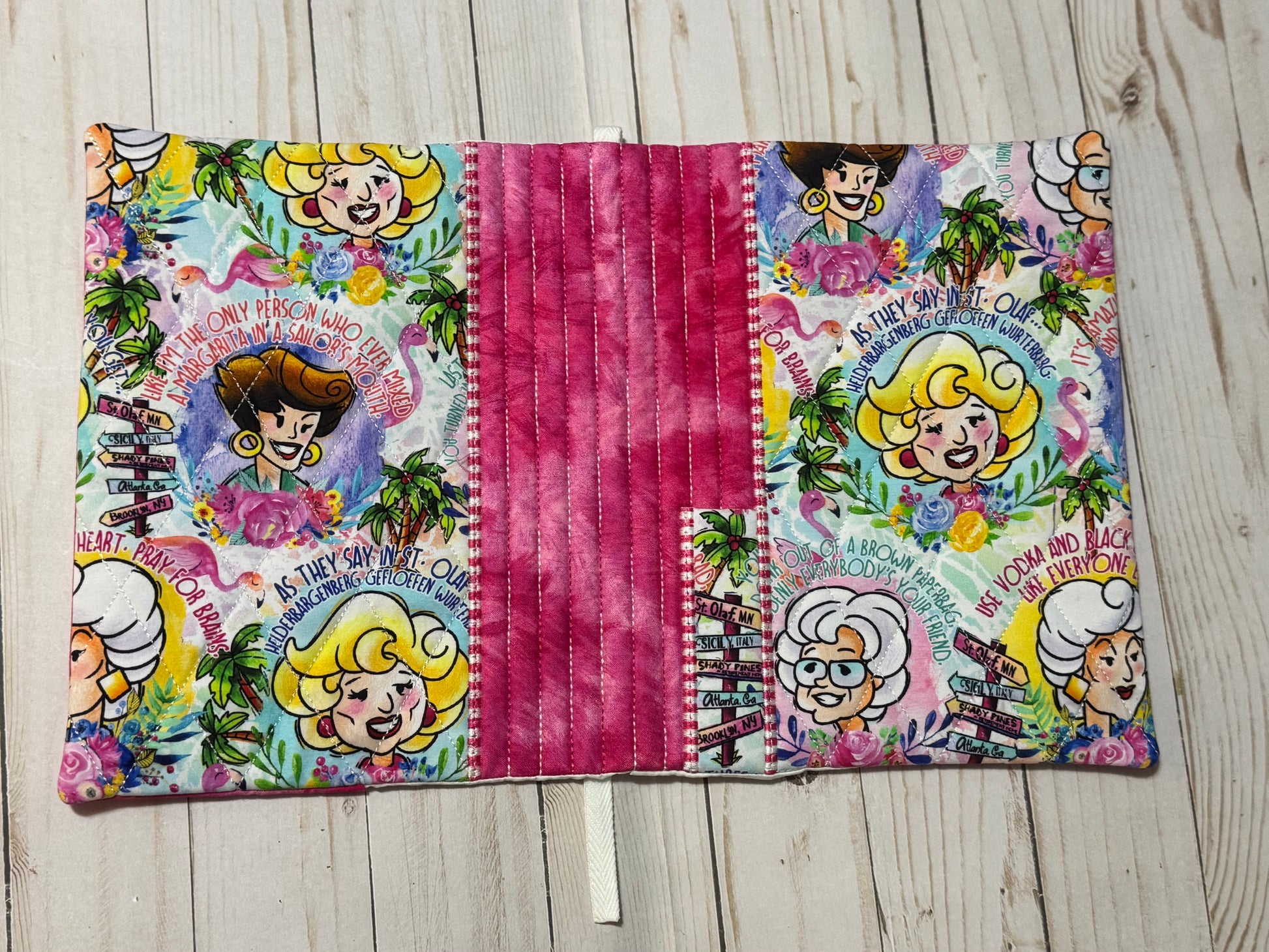 The Front and Back Cover will be your main fabric. Lining, Flaps, Spine may differ but all fabrics used in the journal are from personal inventory collection. Outside Cover and Spine are Quilted with batting. There is a pen holder on the outside spine. The inside flaps are large enough to hold additional papers, notepads.